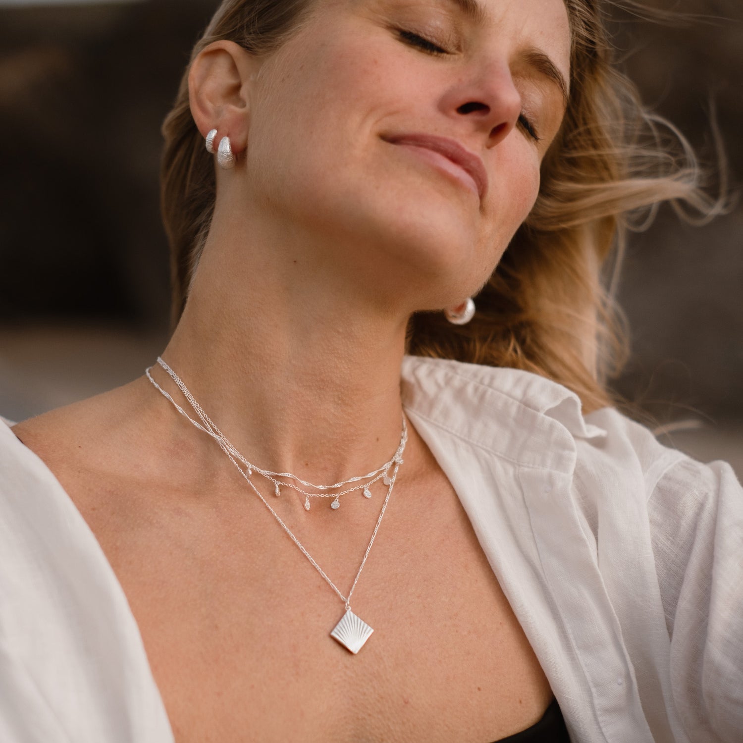 Finish off with a longer pendant, something between 45-55cm would be perfect for this. Creating an iconic stack that will take you from day to night.